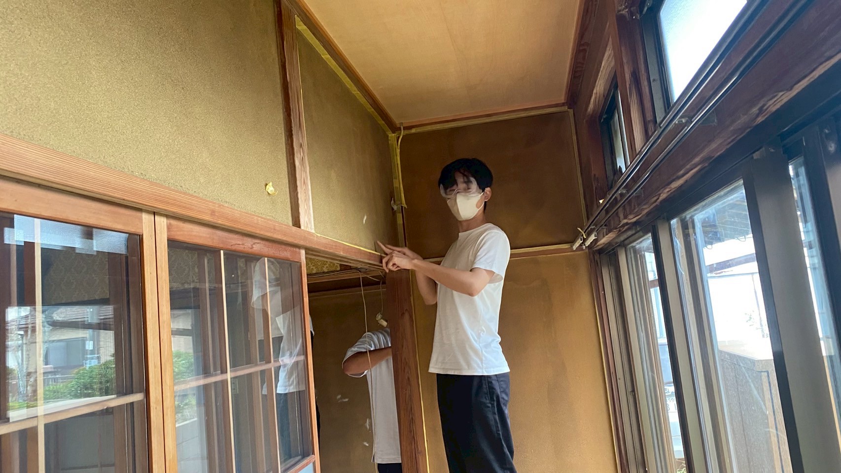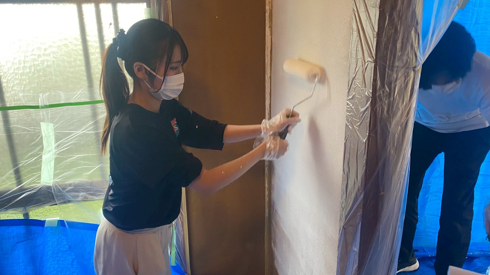 砂壁なので、まずはシーラーを塗って固めて、その上から白のペンキで2回塗装しました。お試しとして1人で塗ってみたのですが、思っていたよりもかなり大変でした。ローラーでコロコロというイメージが、実際はかなり力仕事。これを1人でやり切るのは大変だと思い、佐原のあしたPROJECTの受講生や佐原で活動する大学生にお手伝いに来てもらいました!